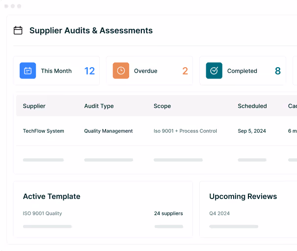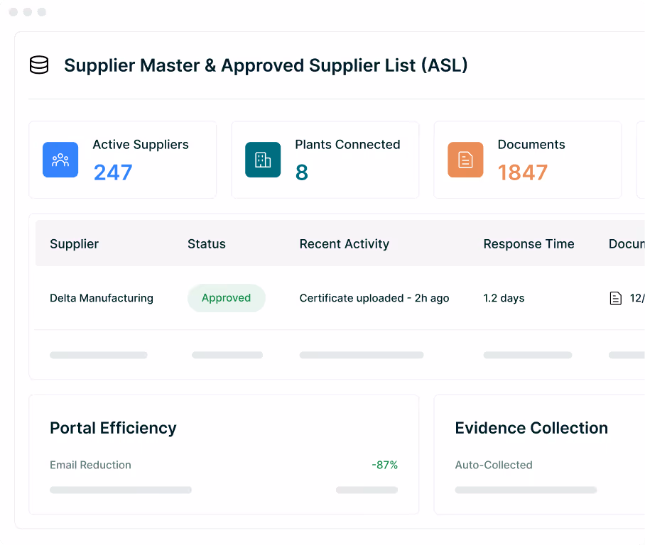 Automate supplier audits, periodic supplier re-evaluations, and supplier compliance checks—prep less, approve faster.Built for Supplier Quality & Audit Teams managing hundreds of suppliers across plants.